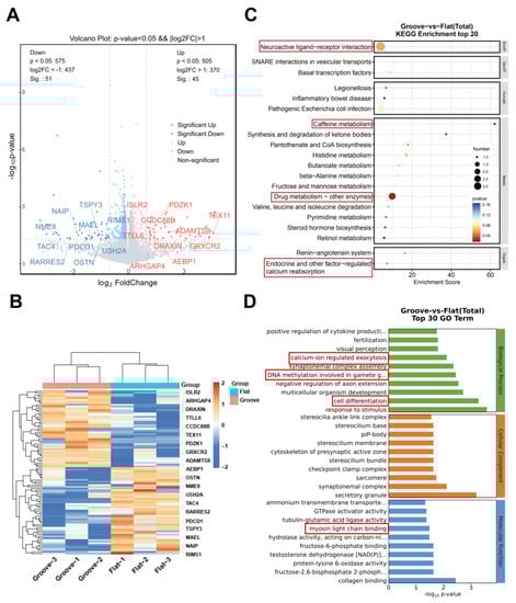 Transcriptome comparison of Schwann cells after being cultured on submicron-grooved (800/400) and flat films for 5 days (n = 3): (A) Volcano plots the total number of genes identified by RNA sequencing. (B) The heat map represents the differentially expressed genes. DEGs were defined as |log2(fold change)| > 1 and q value < 0.05. (C)The KEGG pathway enrichment of DEGs under submicron-grooved and flat films conditions. (D) Gene Ontology (GO) enrichment analysis of DEGs in both cases.