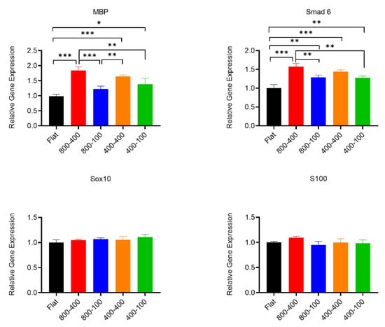 Afterwards, the expression of specific genes of the Schwann cells on all grooved patterns is determined by RT-qPCR. Figure 9 shows the gene expression of Schwann cells in different groups after 5 days of cultivation. The results demonstrate that the submicron grooves can upregulate the expression of MBP and Smad6 in Schwann cells, while their effect on the expression of Sox10 and S100 is negligible. Similarly to the previous findings, the MBP and Smad6 expressions are mainly affected by the depth of the grooves as a significantly higher expression of these two genes can be detected in the 800/400 and 400/400 groove groups, with the 800/400 groove group demonstrating the most pronounced effect.