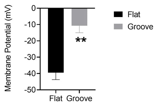Membrane potential of Schwann cells after being cultured on submicron-grooved (800/400) and flat films for 3 days. ** represent p < 0.01 (n = 5).