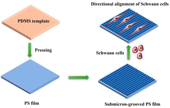 A schematic illustration showing the fabrication process of submicron-grooved films, which can be utilized to direct the alignment of Schwann cells.