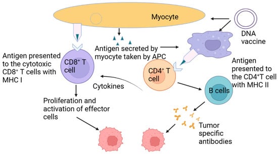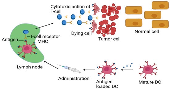 Experts have lauded an effective cancer vaccine [,]. Vaccine administration to non-cellular cancer cells and general design issues are discussed in the following section. For an effective immune response, vaccines must activate the adaptive immune system, which comprises B and T cells. B cells create anti-allergy antibodies as part of a humoral reaction to an allergen. CD4+ cells, for example, aid in the activation of other immune cells, but CD8+ CTLs are critical to the “cellular immunological response”, which is the process of cell killing []. An anticancer vaccination induces a significant CD8+ T cell response that effectively kills cancer cells [,]. To process and present antigens, two stages follow endocytic endocytosis in the immunization process: to make antigen-specific epitopes that bind to MHC (Major Histocompatibility Complex) molecules, proteases process endosomal/lysosomal antigens released into the cytosol. This is the typical approach for subunit vaccinations. MHC Class II molecules deliver endosomal antigens degraded by proteases to CD4+ helper T cells, as shown in Figure 1. For an immune response to be triggered, CD8+ T cells must cross-present. T-cell immunity is heavily reliant on good cross-presentation for a strong cancer vaccination [].