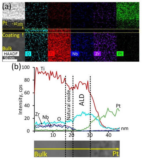 In-depth analysis of the ALD TiO2 coating structure and composition was conducted via TEM studies (Figure 1). The ALD coating is represented by a thin (10 nm) oxide layer, which is vividly seen in the HAADF electron image (Figure 1a). Corresponding elemental maps demonstrate that this layer is enriched with oxygen and contains significant amounts of titanium. It should be noted that this layer is completely free from Zr and Nb, proving that the formed oxide layer consists of Ti oxide exclusively. Note that the Pt signal is due to the platinum layer formed during the lamella preparation. Elemental profiling of a smaller region of the cross-section surface (Figure 1b) reveals other peculiarities. It can be seen that Ti concentration decreases gradually as the analysis spot shifts from the bulk alloy towards the coating region. The oxygen content increases slowly, while the Nb/Zr concentration remains at the same level. At a certain point, the concentration of the main alloy components decreases rapidly: Ti concentration drops by 10–15%, while Zr and Nb contents decrease to zero. In contrast, the oxygen concentration increases significantly. It can be assumed that this thin region of approximately 2–4 nm in thickness is a natural oxide film of the alloy, containing all its components. Closer to the surface, Ti and O concentrations rise rapidly, which is associated with the appearance of the TiO2 ALD coating. According to the STEM image, the width of this region is about 10 nm, which correlates well with the results reported in [35]. On the other hand, considering Ti and O concentration profiles, it can be assumed that the coating is thicker—up to 18 nm.