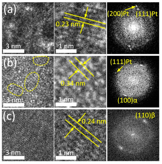 HRTEM images and FFT patterns of Pt layer (a), coating region (b) and adjacent bulk alloy (c).