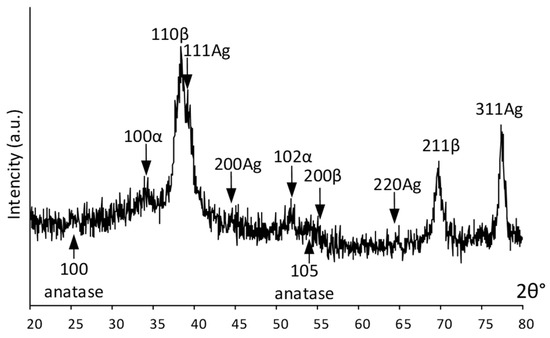 An integral estimation of the surface and near-surface phase composition was obtained using X-ray diffraction. Figure 3 shows the X-ray pattern of the Ag(d)/ALD sample. It can be seen that the signal from the bulk alloy is quite pronounced and the {110} and {211} diffraction lines of the parent β-phase from the near-surface layer are distinctly visible in Figure 3. Low-intensity signals from the TiO2 coating (weak {100} and {105} anatase lines) obtained via the ALD process indicate its rather low thickness. Relatively strong {111}, {311} and weak {200}, {220} Ag reflections indicate significant amounts on the surface. Distinct peaks at ~35° and 52° 2θ deg are attributed to a low-temperature α-phase, which correlates well with the HRTEM results.