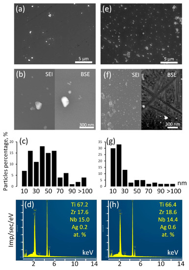 The surface of the Ag/ALD sample is decorated with relatively rare Ag NPs (Figure 4a,b). Their sizes vary in the range from a few nm to a submicron scale. According to the size distribution diagram (Figure 4c), the majority of the Ag NPs have sizes from 40–60 nm. EDX analysis reveals that integral Ag concentration is approximately 0.2 at.%. It can be suggested that colloidal Ag NPs have poor affinity for TiO2 coating formed during ALD. In the Ag(d)/ALD sample, the structure is different. The SEM image obtained at a lower magnification (Figure 4e) demonstrates the presence of a significant amount of submicron Ag NPs evenly distributed over the TiO2 coating. Thorough investigation at higher magnification reveals numerous nanosized Ag NPs densely populating the sample surface (Figure 4f). It should be noted that in the BSE mode, small NPs disappear from the image, which indicates that they reside on the sample surface and are not incorporated into the coating. Ag NPs obtained by this method are much more monodisperse than in the Ag/ALD sample; the vast majority of NPs are smaller than 20 nm (Figure 4g). As expected, the Ag concentration increases as well and reaches 0.6 at.% (Figure 4h). Thus, the deposition of Ag NPs from a colloid solution over the ALD coating appears to be less efficient than the proposed modified technique, which provides a more even NP distribution and higher NP concentration.