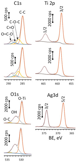 HR-XPS spectra for C1s, O1s, Ti2p (upper spectrum in each pair is for ALD and lower—Ag(d)/ALD samples) and Ag 3d peaks (Ag(d)/ALD sample).