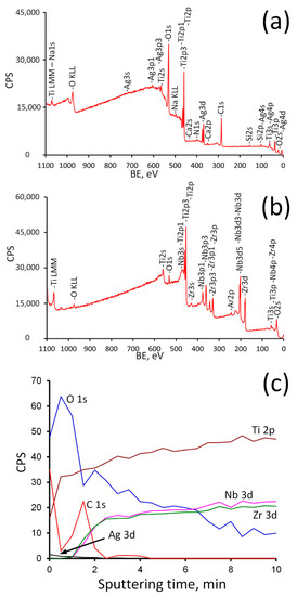 It can be seen that the topmost sample layer consists only of titanium oxide. It indicates that the ALD coating was successfully formed on the surface of Ti-18Zr-15Nb alloy. The natural oxide layer contains all main components of the alloy [62], in our case Zr and Nb. The silver content in the Ag/ALD sample is quite low and noticeably higher for Ag(d)/ALD, which is in a good agreement with the EDX results. After Ar+ sputtering for 10 min, the formed coating as well as surface contaminants are removed and the alloy subsurface layer is exposed. A small amount of oxygen is still present, which indicates that subsurface layers contain some amount of suboxides, and the ratio between the main components differs from that in the alloy. Element depth profile for the Ag(d)/ALD sample is shown in Figure 6. Excess of oxygen and carbon as well as a negligible amount of N, Si and Ca are attributed to the surface contamination of the sample after the coating deposition process.