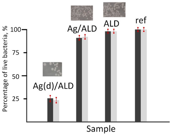 Bacterial growth inhibition on the surface of Ag(d)/ALD, Ag/ALD, ALD and reference samples. Dark bars—optical microscopy results, light bars—spectrophotometry results.