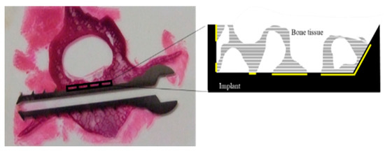 The blinded, HE-stained, non-decalcified hard tissue specimens were examined by three physicians using a VAN0X-T microscope (Olympus Corporation). Images were captured with a 12.5× CCD video camera (DP80; Olympus Corporation) and analyzed using Image J software (National Institutes of Health, Bethesda, MD, USA). Three physicians independently examined the images. For the histomorphometric analysis of bone tissue reaction to the screw, rectangular areas—covering a valley between screw threads within the vertebral body (with height 0.55 m and length 2.0 mm)—were set as regions of interest (ROIs). Each individual ROI (not individual animal) was regarded as an independent sample and was statistically analyzed owing to the ethical limitations of animal use. The justification for this statistical analysis has been described elsewhere [31]. Setting each individual ROI as an independent sample could enable us to evaluate the bone tissue reactions covering a broad variety of bone quality since the screw is in contact with both vertebral bodies rich in cancellus bone and the tissue rich in cancellus bone in the vicinity of the vertebral canal and the pedicle. Setting each individual ROI as an independent sample is similar in condition to other study designs implanting multiple samples in one bone, such as the femur or mandible of an animal. In each ROI, bone apposition and formation rates were calculated and averaged over the three physicians. The bone apposition rate is defined as the implant surface length with bone contact divided by the implant surface length. Moreover, the bone formation rate is defined as the bone area on the implant surface divided by the tissue area on the implant surface [31,32,33] (Figure 1).