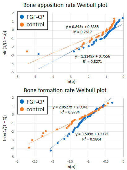 The Weibull plot analysis regarding impaired bone apposition or formation as treatment failure demonstrated the potential efficacy of osteointegration in the FGF-CP group. The Weibull plots were fitted with straight lines (Figure 6). Theoretically, the greater the slope of the line is, the more constant the treatment outcome and the lower the probability of failure. Under the same slope, the lower the straight line is located, the lower the probability of failure. Since the regression line of bone apposition rate Weibull plot for the FGF-CP group passes at a lower level than that of the control group, the FGF-CP has a tendency to lower the probability of impaired bone apposition compared with the control. The reason why the regression line for the FGF-CP group passes at a lower level is that the distribution of bone apposition rates for the FGF-CP group was spread toward the greater value compared with that for the control group (Figure 5a). It should be noted that the spread of distribution toward the greater value leads to an increase in scale parameter ξ in case the slope is the same [45]. In the present study, the distribution of bone apposition rates for the FGF-CP group was spread toward the greater value to a level that the average bone apposition rate was significantly higher in the FGF-CP group than in the control group. The fact that the slope of the regression line of bone formation rate Weibull plot was significantly greater in the FGF-CP group (3.51) than in the control group (2.05; p = 1.07 × 10−25) proves that the FGF-CP leads to a more constant bone formation rate and a lower probability of impaired bone formation than the control.
