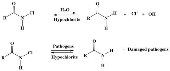 Interest in compounds with covalent bonds between nitrogen and halogen is growing, owing to their excellent antimicrobial ability. Moreover, such N-halamines exhibit prolonged stability in aqueous solution, weak toxicity and low cost, and can be readily regenerated [,,]. Such compounds are attractive for disinfection of water and food []. Their aqueous dissociation constant is quite low, and increases from imide to amide to amine; however, oxidative transfer of chlorine to microorganisms rather than hydrolysis is significantly favored (Figure 1). Although the hydrolysis constant is around 10−8, the transfer of oxidative chlorine from amide-halamine compounds to the bacteria is much more favorable [,,]. For industrial applications, such compounds are considered the most practical due to their moderate chlorine transfer rate.