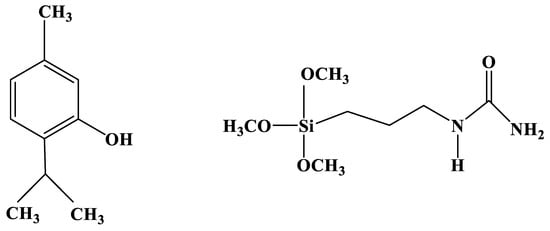 Chlorine-releasing coatings were prepared by chlorination of the SiO2-urea by NaOCl via the urea amide groups to obtain N-chloramine groups, as shown in Figure 2 []. Thymol-releasing coating was prepared by adding the thymol (Figure 3) to the silane-urea monomer (TMSPU, Figure 3), followed by Stöber polymerization in presence of the corona-treated PC film, as shown in Figure 2. The antiviral activity of SiO2-urea-Cl, SiO2-urea-thymol and SiO2-urea-Cl-thymol coatings on the PC films was measured against two different viruses: T4 bacteriophage and canine coronavirus (CCV). This covering can be used as a stable coating for protecting partitions against pathogenic viruses, including SARS-CoV-2.