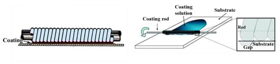 The Corona-treated PC film was coated with TMSPU by spreading the basic mixture of TMSPU in ethanol/water in the absence or presence of thymol using a Mayer rod obtained from RK Print Coat Instruments Ltd. (Litlington, UK) [,]; this is a metal bar wrapped in a wire, which draws a solution over the surface of the substrate (Figure 4). The film thickness is determined by the wire diameter. The substrate was dried for a few minutes in an oven at 110 °C. The formed PC/SiO2-urea and PC/SiO2-urea-thymol films were washed (with water) and dried in air.