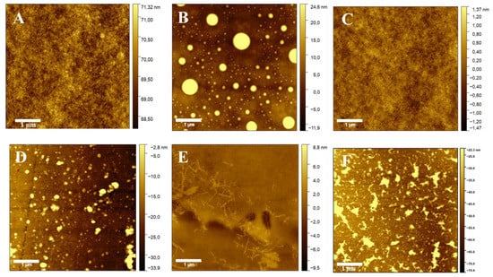 Atomic force microscopy (AFM) measurements of the films were carried out using a scanning probe Bio FastScan microscope (Bruker AXS), with quantitative nanomechanical mapping (QNM) Peak Force mode using a silicon probe (FastScan-C, Bruker, Billerica, MA, USA) with 0.45 N/m spring constant. An acoustic hood was used for minimal vibrational noise, with a scan rate of 1.7 Hz in the retrace direction. The resolution was 512 samples per line. Nanoscope Analysis software (v1.5) was used for image processing and thickness analysis, applying the “flatting” and “planefit” functions. Three areas of the film were averaged (three measurements per area).