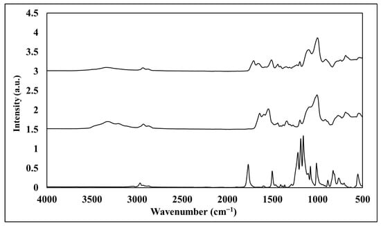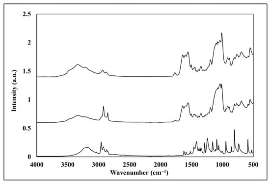 Figure 7 presents the spectra of thymol, PC/SiO2-urea-thymol and PC/SiO2-urea-Cl-thymol. The thymol spectrum [] includes (bottom of Figure 7) peaks of hydroxyl (OH) around 3323 cm−1, CH3 stretching at 2957–2930 cm−1, phenyl (1454 cm−1), and phenol C-O stretching and in-plane OH bending (1344 and 1380 cm−1, respectively). At 806 cm−1, the peak is ascribed to the aromatic out-of-plane C-H and the ring at 947–806 cm−1. The PC/SiO2-urea-thymol film spectrum is presented in the middle of Figure 7. This spectrum shows that thymol is present in the PC/silica-urea film, as indicated by CH3 stretching (2930–2853 cm−1), the phenyl ring (1454, 930–782 cm−1), and aromatic out-of-plane C-H wagging vibrations (806 cm−1). The PC/SiO2-urea-Cl-thymol spectrum presented at the top of Figure 7 illustrates the presence of both thymol and activated chlorine.