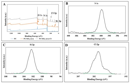 (A) XPS spectra of corona-treated PC (blue), PC/SiO2-urea (orange) and PC/SiO2-urea-Cl (gray) films. Magnification of the PC/SiO2-urea film spectra depicts the peaks corresponding to (B) N 1s and (C) Si 2p, belonging to the SiO2–urea coating. Magnification of the PC/SiO2-urea-Cl film spectrum shows the peaks corresponding to (D) Cl 2p, belonging to SiO2-urea-Cl coating.