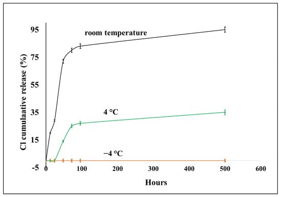 The Section 2 describes the activated chlorine analysis and the evaluation of Cl+ release rates from the PC/SiO2-urea-Cl and PC/SiO2-urea-Cl-thymol films. Figure 9 exhibits release rates from PC/SiO2-urea-Cl at RT, 4 °C and −4 °C. In the first 24 h, 20% of the Cl+ content is released; after 48 h, 70% is released, which increases to 90% after a few weeks (500 h). Storing the coating at 4 °C (green line) significantly slows down the release rate, as shown in Figure 9. In addition, storing the coating at −4 °C does not release any chlorine even after 500 h. This is probably due to the significant decrease in exposure to microorganisms at these temperatures. Similar release rates of Cl+ as a function of temperature were also observed for the PC/SiO2-urea-Cl-thymol film.