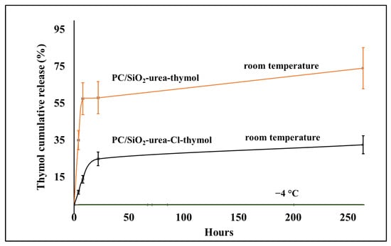 Figure 10 exhibits the release rates of thymol at room and low temperatures (−4 °C). At RT, both coatings exhibit a massive release of thymol after 10 h, after which the rate decreases. After 22 h, about 60% of the thymol was released from PC/SiO2-urea-thymol. However, the release from PC/SiO2-urea-Cl-thymol is considerably slower (~25%). This is in accordance with hydrophobic interactions between the aromatic ring of thymol and the chlorine of the N-halamine, which are expected to decrease the release rate. Figure 10 also shows that storing both films at −4 °C completely prevents the release of thymol, a behavior similar to that illustrated in Figure 9 for the release of activated Cl from the PC/SiO2-urea-Cl film.