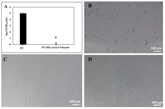 Antiviral activity against CCV (A) showing log(TCID50/mL) on the bare PC and SiO2-urea-Cl-thymol coated surfaces. Microscope images ×100 of CRFK cells incubated with CCV on bare PC (B) and on PC coated with SiO2-urea-Cl (C) or SiO2-urea-Cl-thymol (D). The SD is based on one experiment in triplicate. * represents Student’s t-test at a significance level of p < 0.05.