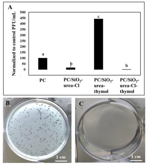 Antiviral activity against bacteriophage T4. (A) Normalized PFU/mL on bare PC and coated surfaces. Images show a layer of E. coli on wells with 1.75 cm radius after seeding bacteriophages from (B) bare PC and (C) PC/SiO2-urea-Cl-thymol. The SD is based on three experiments performed in triplicate. Each letter represents an insignificant group, using an ANOVA test and Fisher’s least significant difference (LSD) post hoc test, with a significance level of p < 0.05.