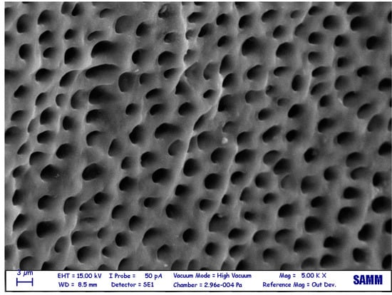 Electron microscopy (5000×) surface of a demineralized dentin after the Tooth Transformer treatment. The surface is cleaner and smoother than non-demineralized dentin.