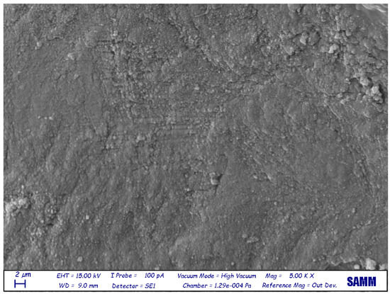 Electron microscopy (5000×) surface of a non-demineralized dentin granule. The surface is rough, dirty, and full of debris, and the dental tubules are not clean or closed.