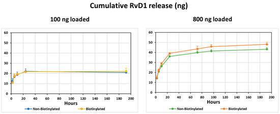 RvD1 release from biotinylated or non-biotinylated collagen membrane discs in two sub-groups: 100 ng and 800 ng of RvD1. For each time point, the mean and se of four replicates is shown.