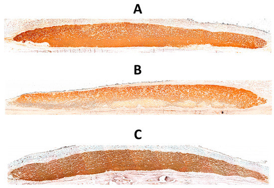 Figure 2 shows histologic views of biotin-avidin-HRP-stained collagen membranes. The ethanol-treated membrane from the control (normoglycemic) group exhibits a higher biotin-avidin-stained area, i.e., a denser core (Figure 2A). In contrast, the ethanol-treated membrane from the diabetic group is thinner and exhibits larger gaps, a lower density of biotin-avidin staining, and a greater variability in thickness (Figure 2B). However, the membrane from the diabetic group, to which 800 ng of RvD1 were added (Figure 2C), has fewer and smaller voids than the diabetic membrane and a greater uniformity in thickness, thus resembling the control membrane.