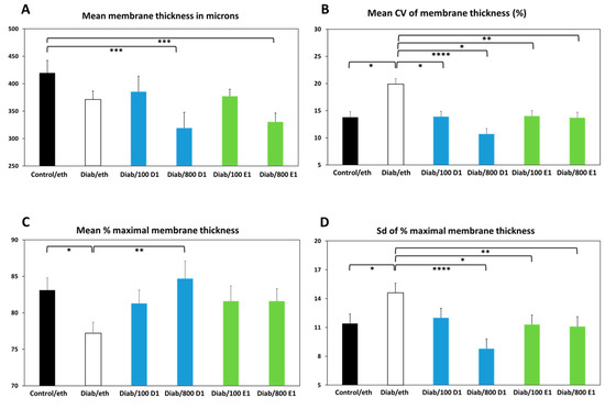 (A) Mean membrane thickness in microns; (B) mean CV of membrane thickness in %; (C) mean % of maximal membrane thickness; (D) sd of % maximal membrane thickness. Control = normoglycemic; eth = ethanol; Diab = diabetic; 100 D1 = 100 ng RvD1; 800 D1 = 800 ng RvD1; 100 E1 = 100 ng RvE1; 800 E1 = 800 ng RvE1. * p < 0.05; ** p < 0.01; *** p < 0.005; **** p < 0.001.