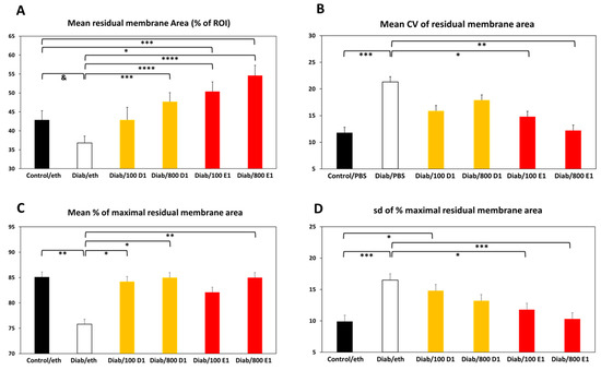 (A) Mean residual membrane area (% of ROI); (B) mean CV of residual membrane area (in %); (C) mean % of maximal residual membrane area; (D) sd of % maximal residual membrane area. Control = normoglycemic; eth = ethanol; Diab = diabetic; 100 D1 = 100 ng RvD1; 800 D1 = 800 ng RvD1; 100 E1 = 100 ng RvE1; 800 E1 = 800 ng RvE1. & p = 0.06; * p < 0.05; ** p < 0.01; *** p < 0.005; **** p < 0.001.