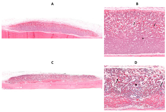 (A,C): Histologic view (×40) of an H&E-stained collagen membrane in a rat from the control group and diabetic group, respectively. (B,D) show a higher magnification (×125) of these membranes. * old (original) collagen fibers (purple), black arrows—new elastic fibers, white arrows—new collagen fibers.