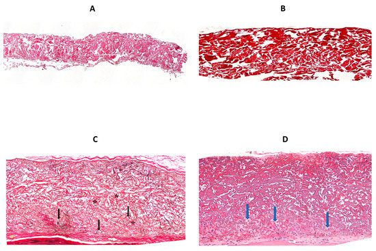 Implanted membranes contained three types of fibers; the majority of the membrane volume contained thick, purple collagen fibers (* in Figure 5B,D) that were part of the original membrane. In addition, numerous red, thin, undulating fibers were found within the gaps between the original collagen fibers (black arrows in Figure 5B,D, H&E stained). These could theoretically be either elastic fibers from the original membrane, new elastic fibers that were deposited within the gaps post-implantation, or new collagen fibers. These undulating fibers are not present in the original membrane (Figure 6A (H&E) or Figure 6B (elastin stain)) and are positive for elastin staining in the implanted membrane (Figure 6C) and therefore are newly formed elastic fibers located among the original collagen fibers.