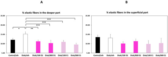 Percentage area occupied by new elastic fibers in the superficial (A) and deeper (B) part of the membrane. Control = normoglycemic; eth = ethanol; Diab = diabetic; 100 D1 = 100 ng RvD1; 800 D1 = 800 ng RvD1; 100 E1 = 100 ng RvE1; 800 E1 = 800 ng RvE1. * p < 0.05; ** p < 0.01; *** p < 0.005.