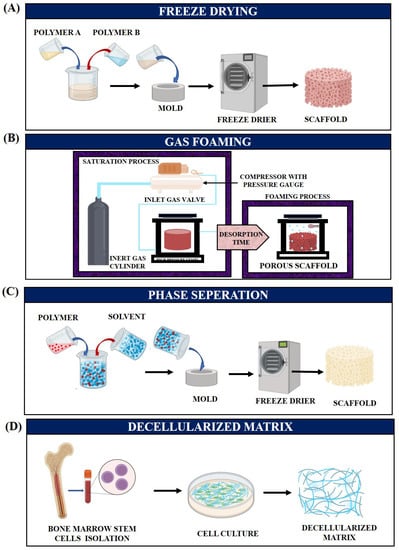FD is a conventional technique that empowers fabricating 3D porous scaffolds with a porosity of over 90% and a pore diameter span of 20–400 µm [38]. It is a three-step method that involves preparing a solution to be freeze-dried, freezing the prepared solution at −20 °C to −80 °C, and lyophilizing it in a negative pressure environment (Figure 3A). Haghbin et al. created biodegradable PCL/CS/Gel porous scaffolds, which showed better mechanical properties, with maximum strength (25 MPa), a favorable modulus (3.86 MPa), and a faster deterioration rate than other scaffolds. Cell survival and adhesion were verified, demonstrating their potential application as a bone substitute. In order to replicate the bone ECM, FD methodology was exploited to develop a highly porous scaffold with a porosity level of more than 90% [39].