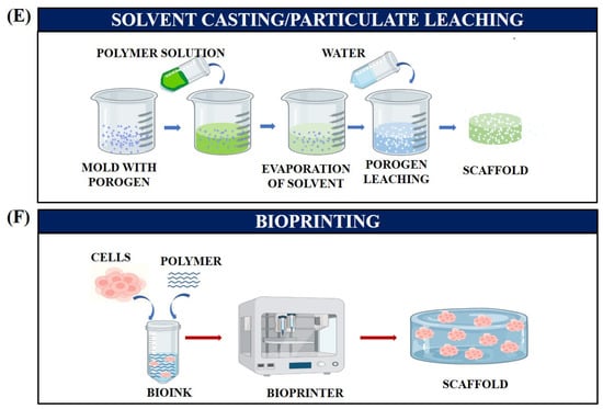 The solvent casting/particulate leaching fabrication method is a standard technique that comprises an insoluble salt annexed to the polymer solution after it has been dissolved in the appropriate solvent (Figure 3E). A salt–polymer composite can be established by evaporating the solvent and washing the salt particles aside; this is a simple and straightforward process that does not demand the aid of extravagant and complex equipment. In addition, the technique allows for precise control of the final porosity (pore size, interconnectivity) and pore density by a proper selection of the polymers, porogens, and their respective amounts [47]. Huang et al. devised a porous scaffold with graphene platelets and salt (NaCl) that was exploited to create porous biomedical scaffolds by employing a solvent casting/particulate leaching fabrication technique. The prepared scaffolds showed much higher porosity (more than 85%; pore size: 250–400 µm) and more interconnected structures than those produced using other fabrication procedures [48].