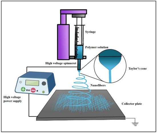 In contrast to other fabrication techniques, electrospinning results in scaffolds with enhanced cellular adhesion, proliferation, and differentiation. These characteristics are likely due to the high specific surface-area-to-volume ratio afforded by a low-dimensional fibrous structure. Moreover, electrospinning is captivating, owing to its competence to manufacture NFs with structural resemblance to the native ECM, which may also enhance angiogenesis in different tissues [78]. Electrospinning is an accustomed fabrication technique that has been regarded as a process of developing microfibers to NFs from polymeric solutions at atmospheric pressure and room temperature by employing an elevated electric field (kV). The three cardinal components of an electrospinning device are the power supply (high voltage), the syringe (spinneret), and the collector (electrode) [79]. A schematic representation of the ES technique process is depicted in Figure 4.