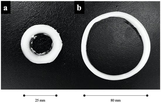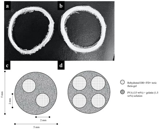 DR+/FD+ tori were subsequently used to produce low-density theta gel-reinforced hydrogels (LD-TRH) and high-density theta-gel-reinforced hydrogels (HD-TRH) for mechanical characterisation. The rehydrated DR+/FD+ toric theta-gel samples were placed in toric moulds of 80 mm diameter and 5 mm cross-sectional diameter—two toric theta gels were used for LD-TRH (Figure 2a,c). Four toric theta gels were used for HD-TRH (Figure 2b,d). The moulds were then filled with an aqueous solution of PVA (15 wt.%) and gelatin (1.5 wt%) and then subjected to six rounds of freeze-thawing, with each freezing and thawing stage carried out overnight. After the sixth freeze–thaw round, the LD-TRH and HD-TRH samples were rehydrated with deionised water.