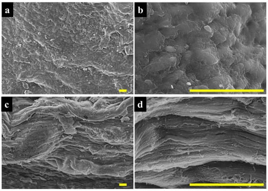 Figure 3a,b shows the surface microstructure of the DR−/FD+ PVA theta-gel samples at 500× (Figure 3a) and 5000× magnification (Figure 3b). The microstructure of DR−/FD+ theta-gel samples showed a relatively homogenous microstructure typically observed in dry hydrogels with closed pores. In contrast, we observed a highly longitudinally oriented microstructure along the direction of mechanical drawing for the DR+/FD+ PVA theta-gel samples at 500× and 5000× magnification (Figure 3c,d, respectively).