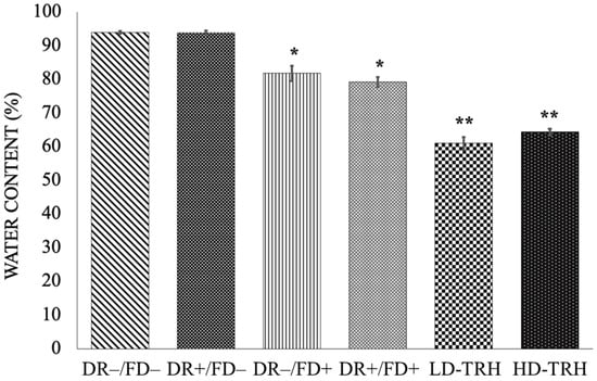 Equilibrium water content exhibited by the toric theta gels and theta-gel-reinforced hydrogels. *: p < 0.05 vs. DR−/FD− and DR+/FD−; **: p < 0.05 vs. DR−/FD−, DR+/FD−, DR−/FD+, and DR+/FD+.