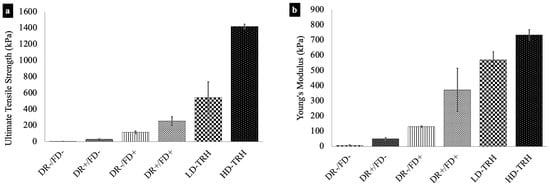 HD-TRH showed tensile strength and modulus of 1417.8 ± 190.2 kPa and 570.3 ± 52.6 kPa, respectively. The increase in both tensile strength and modulus for HD-TRH when compared to LD-TRH is statistically significant (p < 0.05).