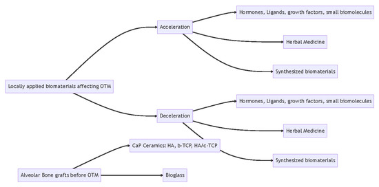 Several biomaterials or biosubstances, such as hormones, ligands, and growth factors, involved in the physiological processes of OTM were applied locally as stimuli to the paradental tissues to change the pace of OTM [4,5,6,7,8,9,10,11,12,13,14,15,16,17,18,19,20,21,22]. Some naturally extracted herbal medicines [23,24,25,26,27] or synthesized biomaterials, such as gelatin-reduced graphene oxide [28] that affects bone remodeling, were also investigated for the application of accelerated or decelerated OTM with different extents of root resorption. As one of the potential risks of OTM, root resorption can occur simultaneously when the process of OTM is intervened, especially in accelerated OTM. Different dosages or functionalization of the biomaterials were also tested in some studies to minimize root resorption while controlling the speed of OTM, which will be discussed and summarized in this review.