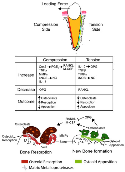 Mechanical loads to teeth cause responses of both mineralized and non-mineralized tissues [31]. The response of mineralized tissue often refers to alveolar bone remodeling that causes bone resorption on the compression side and bone deposition on the tension side [1]. Bone resorption is mainly mediated by osteoclasts, whereas bone formation is mainly mediated by osteoblasts [32]. The elucidation of several biochemical processes involved in osteoclastogenesis or osteoblastogenesis offers the ability to target stages of the pathways for the regulation of OTM. During OTM, osteocytes are generally considered first activated by a local strain at the cell membrane in response to mechanical forces [33]. According to Verborgt el al. [34] and Bonewald [35], osteocytes may also send signals for activation of the bone resorption cascade through the expression of activator for Receptor Activator of Nuclear factor Kappa-β Ligand (RANKL) as one of the key factors in bone remodeling. Several signal molecules or biomaterials targeting the RANK/RANKL/OPG pathway, such as TNF-α, PGE2, EGF, etc., were studied for their effects on OTM [4,5,6,13].