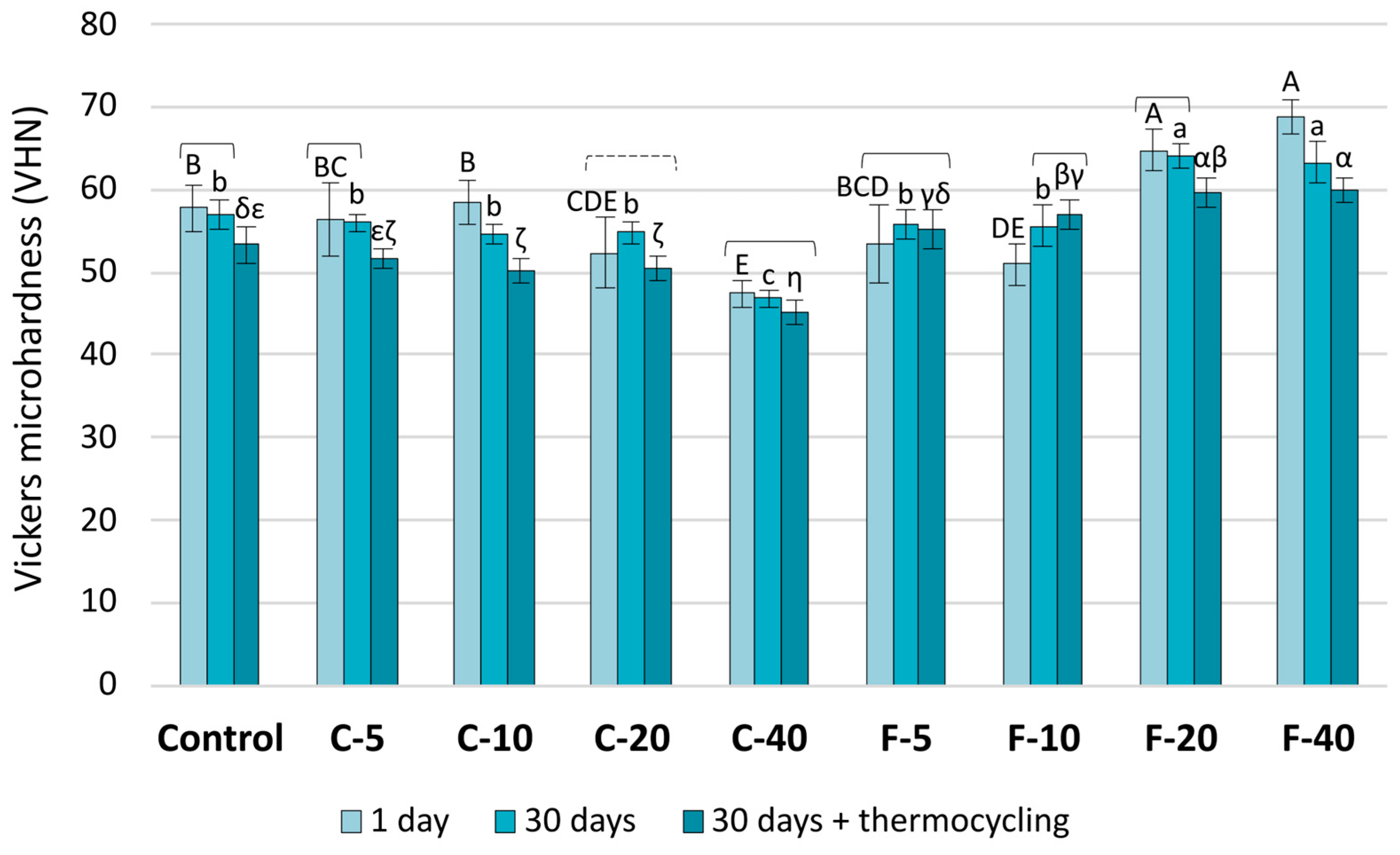 - aging in distilled water at 37 °C for 30 days, followed by thermocycling (10,000 cycles between 5–55 °C, dwell time: 30 s) which simulates 1-year aging [24].