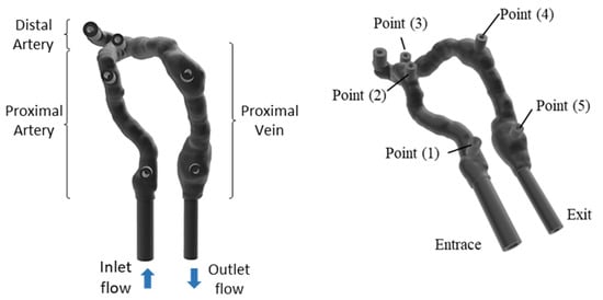 The next phase of the work was the data processing. Initially, corrections were made in the virtual mesh generated by closing open elements resulting from the surface generation process. The next step in the process was the insertion of inlet and outlet ducts and pre-selected points for the investigation of pressure (two points in the arterial region, one point in the anastomosis and two points in the venous region—pseudoaneurysms), as shown in Figure 2.