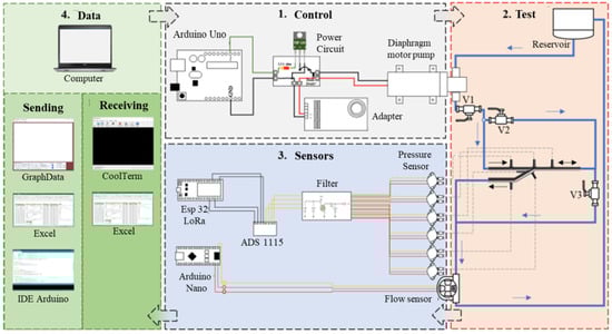 After the fabrication of the AVF models, tests on an experimental workbench to simulate the systolic–diastolic pulse were performed (Figure 4). The workbench was subdivided into: control, test, sensors and data sections. Arrows indicate the flow of experimental steps between sections of the experimental bench.