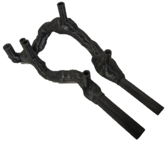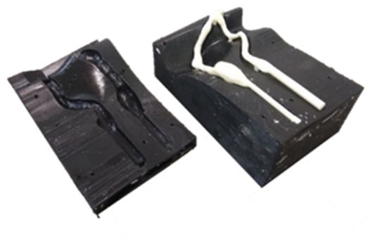 The fabrication of the flexible AVF started with the fabrication of the mold. The molds developed had problems with centering, which were corrected by inserting a central plane in the entire geometry of the AVF, coinciding with the center line of the entire AVF, in addition to using the accesses themselves as points for centering. The manufactured mold can be seen in Figure 7.