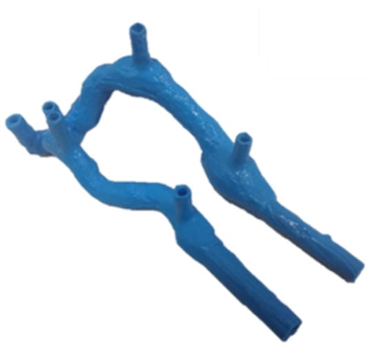 Based on the geometry developed in the previous steps, a 3D printing of the rigid model of the AVF was performed. Among the parameters used, we can highlight: the material, the thermoplastic polymer ABS (acrylonitrile butadiene styrene), and the 100% filling, ensuring rigidity and preventing leaks during the tests.