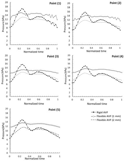 Pressure values at points (1), (2), (3), (4) and (5) were collected and analyzed in the three AVF models during the experiments with pulsatile flow. The pressure pulses at the points described above in the three AVF models are shown below—Figure 9.