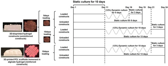 Schematic of the experimental conditions used in this study to compress unreinforced and reinforced constructs. In the figure, sinusoidal waveforms depict dynamic compression inside the bioreactor with 12% strain at 1 Hz frequency for 3 h/day, and horizontal lines indicate a static culture of the constructs in 6-well plates.