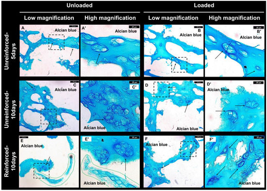 Sections generated from different construct groups were stained with Alcian blue to observe GAG deposition for ATDC5 cell’s chondrogenic differentiation. The alginate matrix was stained blue in the background, as was observed in our previous study as well. However, there were darker blue areas surrounding either single or clusters of cells, which distinguished the deposited GAG from the lighter blue background, indicating the differentiation of the cells to chondrogenic cells (Figure 2A–F,A’–F’, pointed to with arrows). Several clusters of cells were indeed observed at various regions of the constructs from all experimental groups. These clusters were dispersed throughout the hydrogel sections, and their formation could be attributed to either cell proliferation during the culture period or the initial impregnation process. As we attempted to ensure thorough cell dispersion before and during the mixing with the alginate solution, the abundance of these clusters at various regions suggests that cell proliferation is the primary factor contributing to their formation. (Figure 2A–F). The cell numbers were still low, as there were large areas of hydrogel matrix between cell clusters. It seemed that the cell numbers were lower in the unloaded and loaded un-reinforced-5 days constructs (Figure 2A,B) than the unreinforced-10 days and rein-forced-10 days constructs both in the unloaded and loaded conditions (Figure 2C–F). Elongated clusters of cells were observed in the sections from the reinforced constructs, which might have been attached to the PCL strands (Figure 2E,E’, solid red line).